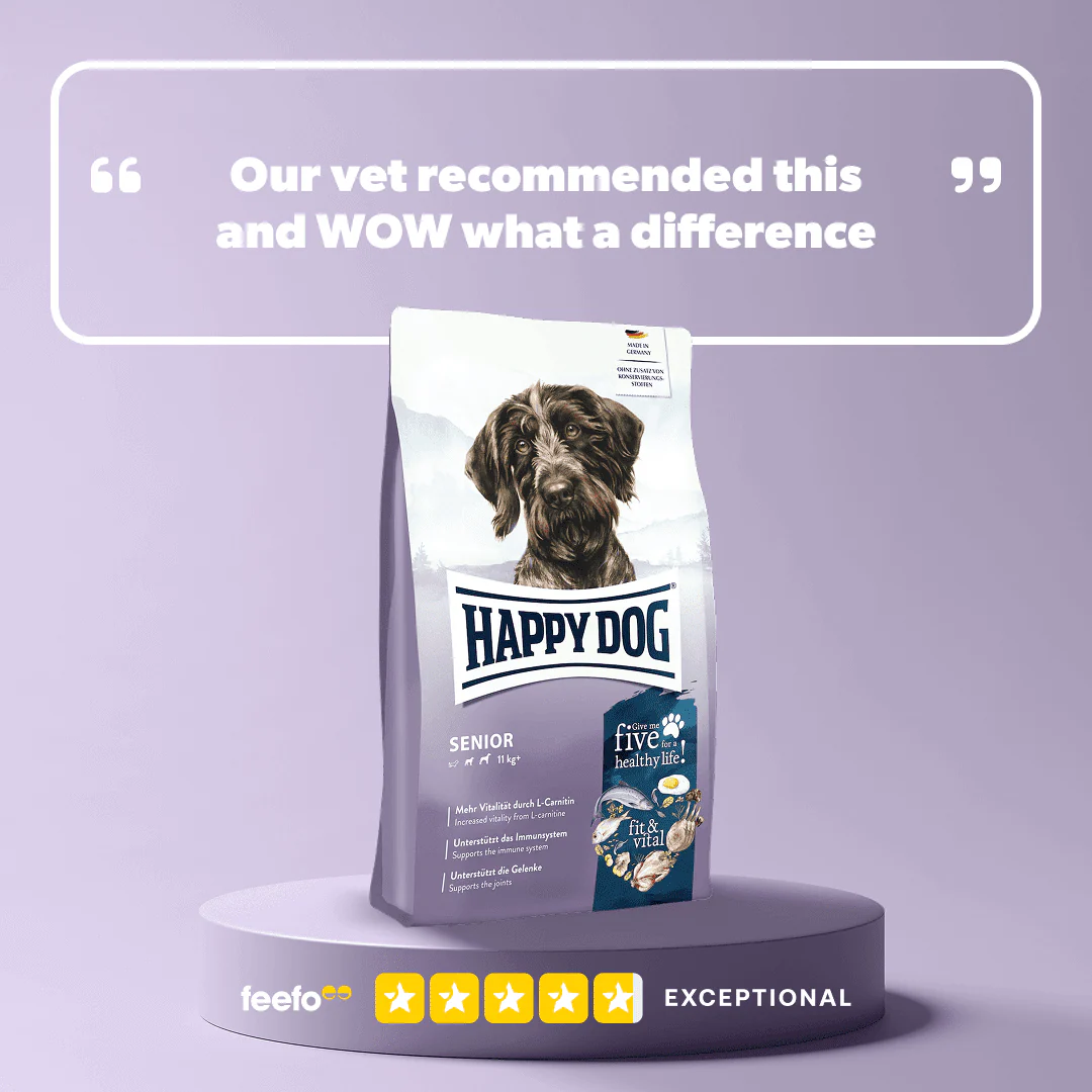 Fit & Well Senior is crafted for older dogs, supporting vitality with omega oils for a healthy coat and L-carnitine for energy. Wheat-free and enriched for joint, heart, and kidney health.